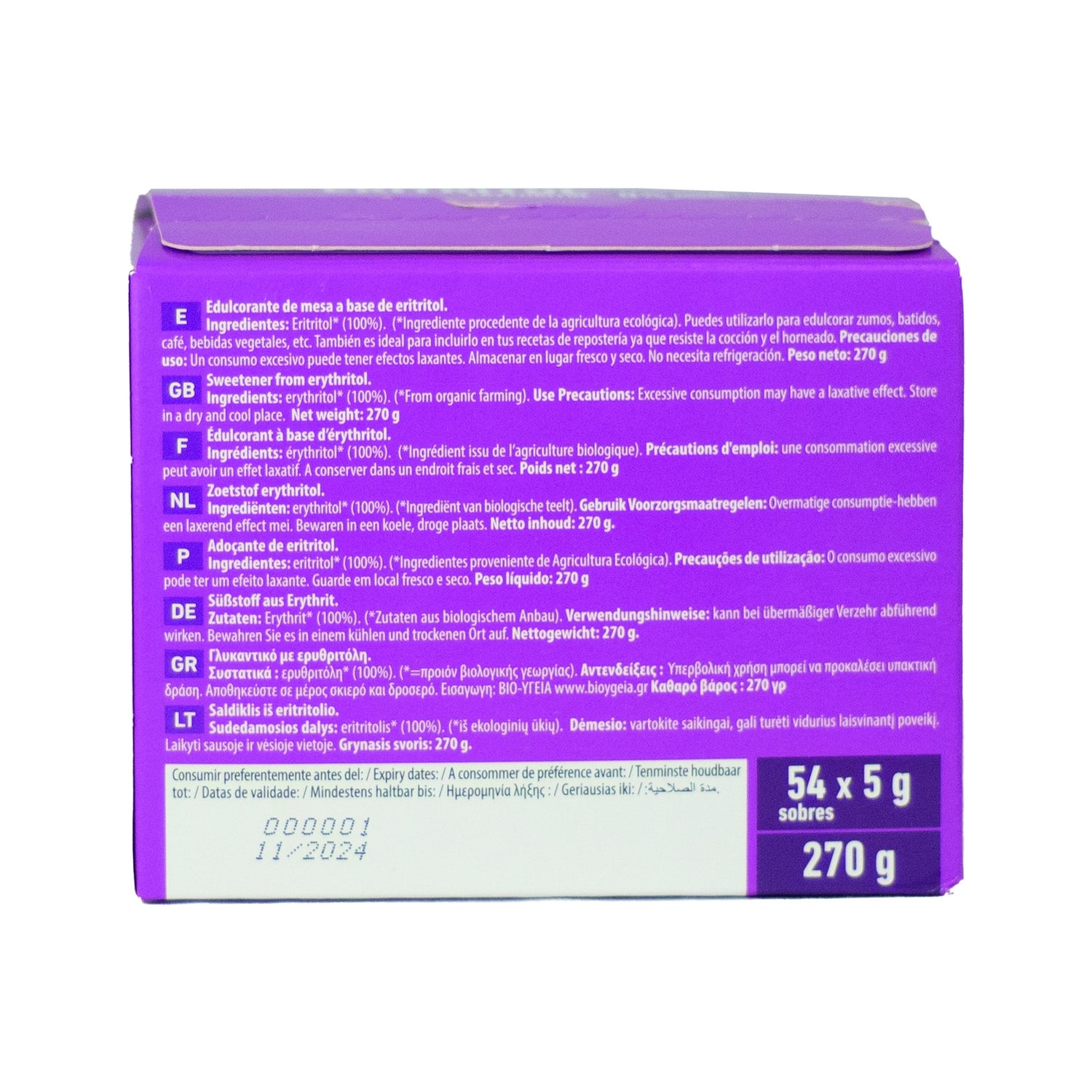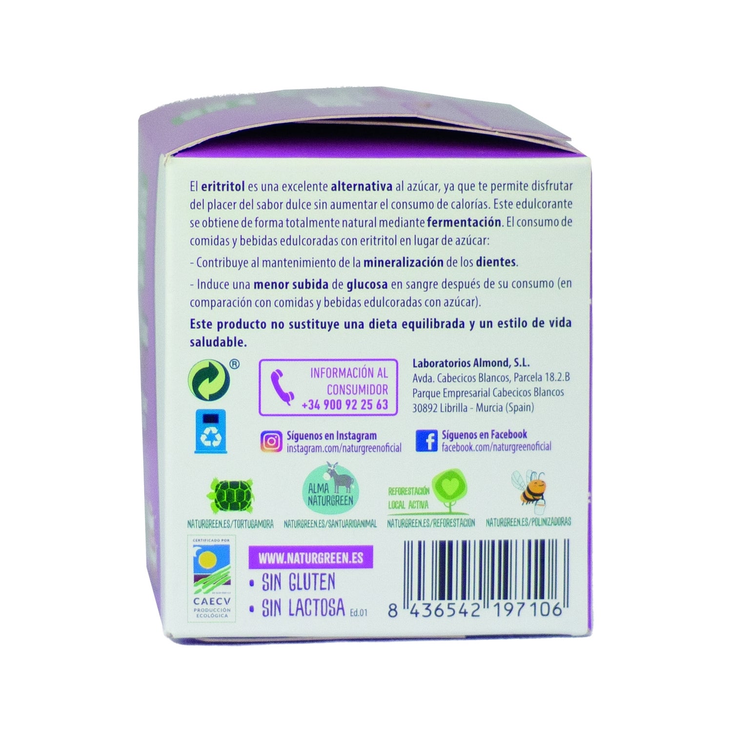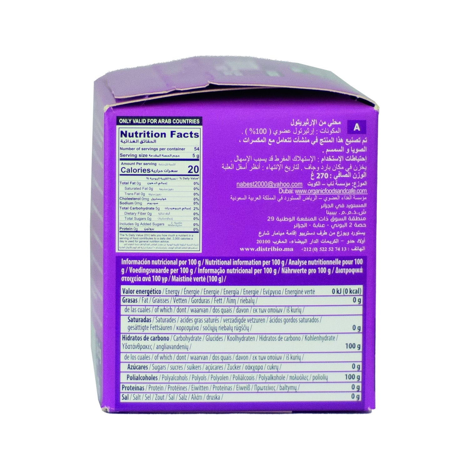 Edulcorante em pó feito de 100% eritritol, adequado como substituto do açúcar branco regular e da sacarina. Fornece até 70% mais poder adoçante do que os açúcares tradicionais. É um composto com acção adoçante, de origem vegetal, recomendado para adoçar sumos, smoothies, infusões, bebidas vegetais e café. É também utilizado em preparações de panificação, uma vez que é resistente à cozedura. Produto orgânico certificado. Vem numa lata com uma tampa hermética.