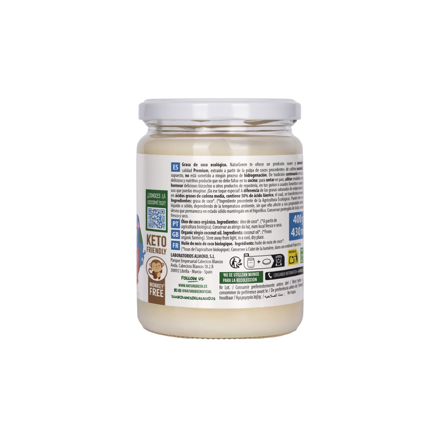 É elaborado somente com cocos de cultivo ecológico provenientes do Sri Lanka, fabricado utilizando métodos de extração e prensagem a frio, sem refinar nem branqueamento, por isso mantém todas as suas propriedades benéficas inalteradas. Além disso, é livre de colesterol e gorduras trans.