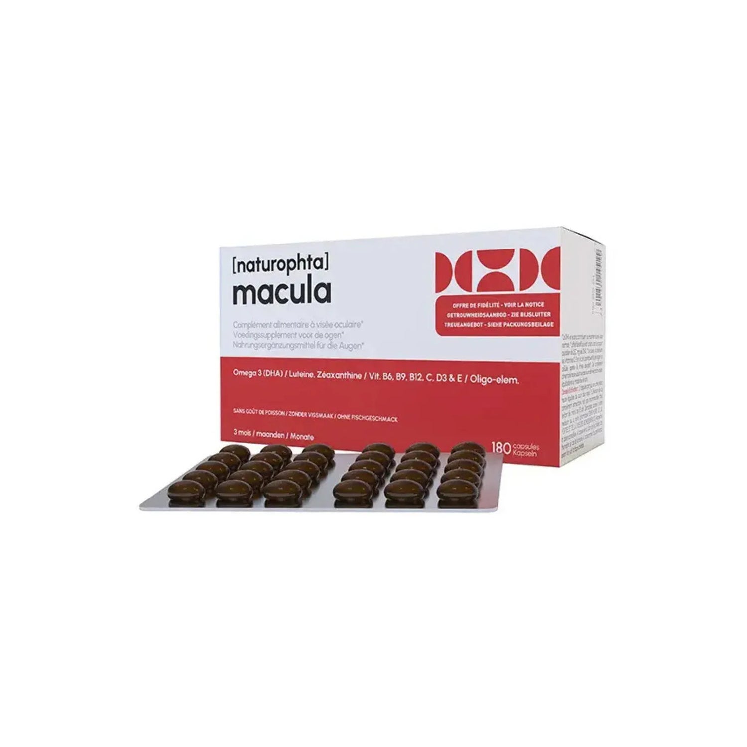 Naturophta Macula 180 Cápsulas é um suplemento alimentar para os olhos que contém um complexo de vitaminas B, C e E, carotenóides e zinco, e é rico em Ómega 3 contido no óleo de peixe. Os ómega 3 são nutrientes que ajudam a proteger a retina e a melhorar o conforto ocular. Foi utilizado um tratamento ultra-desodorizante para garantir que o óleo de peixe é inodoro. Os suplementos alimentares nunca devem ser utilizados como substitutos de uma dieta saudável e equilibrada.