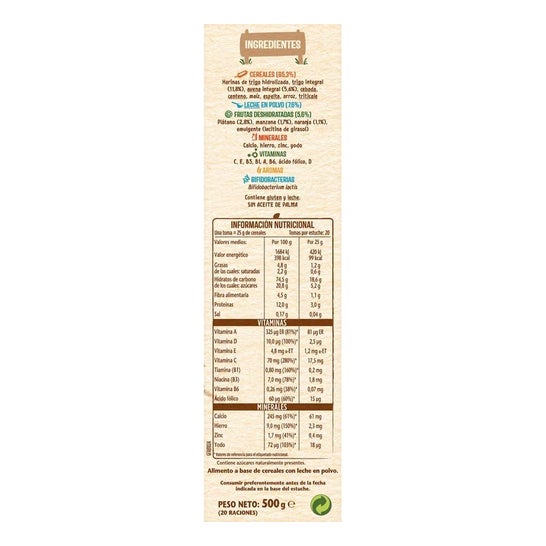 Nestle 8 Cereals with Fruit +6M 500g é um cereal e papa à base de fruta adequado para bebés a partir dos 6 meses de idade. Contém trigo, aveia integral, cevada, milho, espelta, triticale e frutos desidratados, uma fórmula com elevado teor vitamínico. Também é enriquecido com ferro, cálcio, zinco e iodo e é feito sem açúcares. Contém 500g.