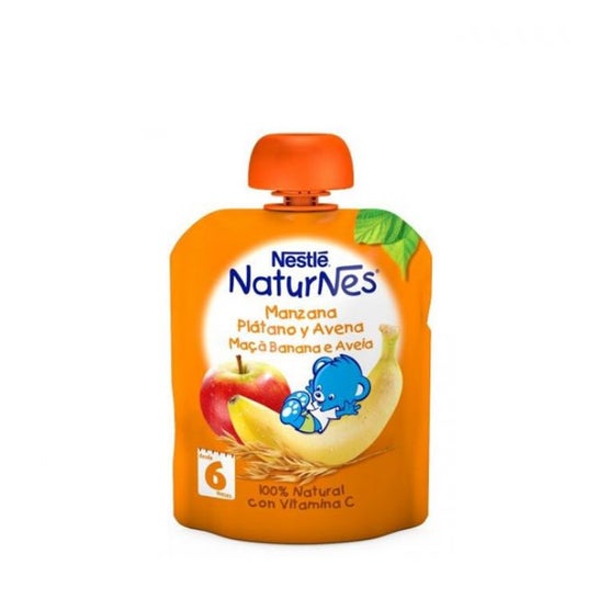 Nestlé Naturnes Maçã, Banana e Aveia 90g é uma saqueta de fruta concebida para ser consumida como snack em qualquer altura e lugar.