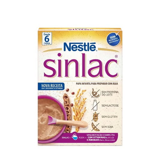 Nestlé Sinlac é uma papinha de cereais de alto valor nutritivo que se caracteriza pela ausência de leite, lactose, glúten e soja, por isso pode ser utilizada nos casos de intolerância a algum desses ingredientes. Ao contrário das demais papinhas, Sinlac se prepara com água de forma rápida e simples.