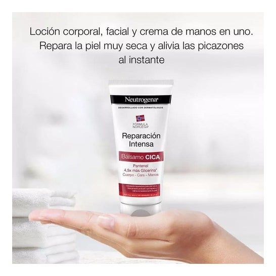 Neutrogena® Bálsamo Reparador Intenso CICA 100ml foi criado a pensar no cuidado das peles mais necessitadas, sendo um aliado perfeito para pessoas com pele muito seca e sensível, pois hidrata em profundidade e alivia a sensação de comichão, picadas e irritações cutâneas. A sua fórmula com Glicerina de origem vegetal e Pantenol é indicada para o cuidado de todos os tipos de pele e ajuda a melhorar a regeneração celular, ajudando a cicatrizar, proporcionando uma nutrição intensa e cuidando da pele.