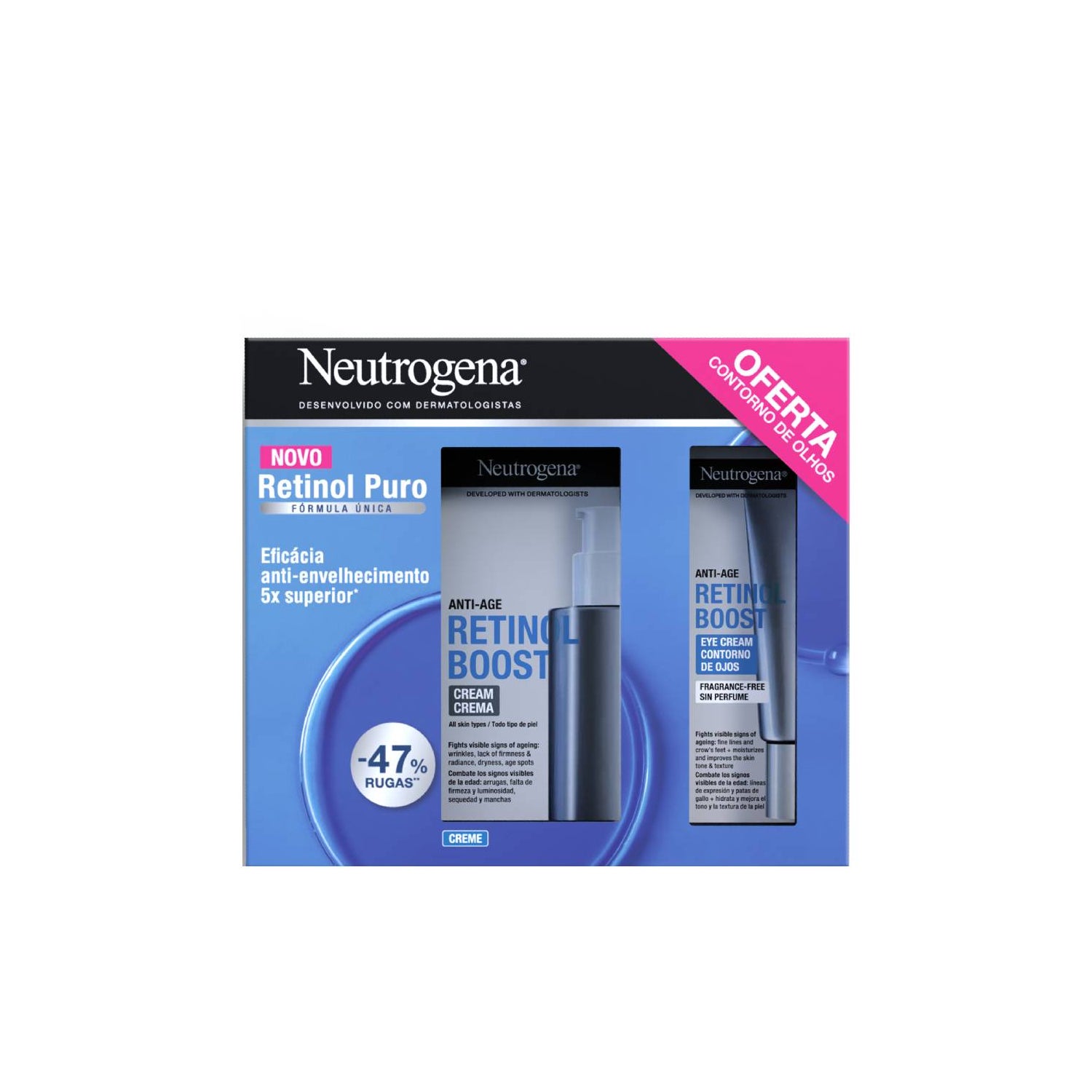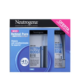 Pack Neutrogena Retinol Boost de Creme antienvelhecimento e Contorno de olhos - Para uma pele mais jovem e saudável Transforma a aparência do teu olhar e da tua pele com este pack de Neutrogena Retinol Boost. A fórmula da Creme hidratante antienvelhecimento com retinol, extrato de folha de murta e ácido hialurônico aporta uma dose de retinol puro à superfície da pele e combate os sinais visíveis da idade, como as rugas, a diminuição da firmeza, a pele cansada, a secura ou manchas de pigmentação. A fórmula avançada do Contorno de olhos, enriquecida com retinol puro, foi projetada para combater os sinais visíveis do envelhecimento, reduzindo as linhas de expressão e as patas de galo, ao mesmo tempo que melhora a luminosidade e unifica o tom da delicada área do contorno dos olhos. Graças à sua combinação de ingredientes eficazes, como o retinol puro, que estimula a produção de colágeno e a regeneração celular, ajudando a combater as rugas e o aspecto apagado; o extrato de murta, que potencializa a eficácia do retinol graças às suas propriedades regeneradoras; e o ácido hialurônico, que hidrata e reafirma a pele, o contorno de olhos e a creme para o rosto proporcionam à pele um aspecto saudável e radiante. Suas fórmulas únicas são tão eficazes que 100% das pessoas que experimentaram esta rotina notaram uma melhoria visível em uma semana*. Vantagens do produto: Rotina de creme antienvelhecimento e contorno de olhos Combatem os sinais da idade Melhoram a textura e o aspecto da pele Hidratam Com retinol puro, ácido hialurônico e extrato de murta Formato: contorno de olhos (1 x 15 ml), creme antienvelhecimento (1 x 50 ml) *Testado clinicamente em 36 mulheres durante 8 semanas, com uso diário.