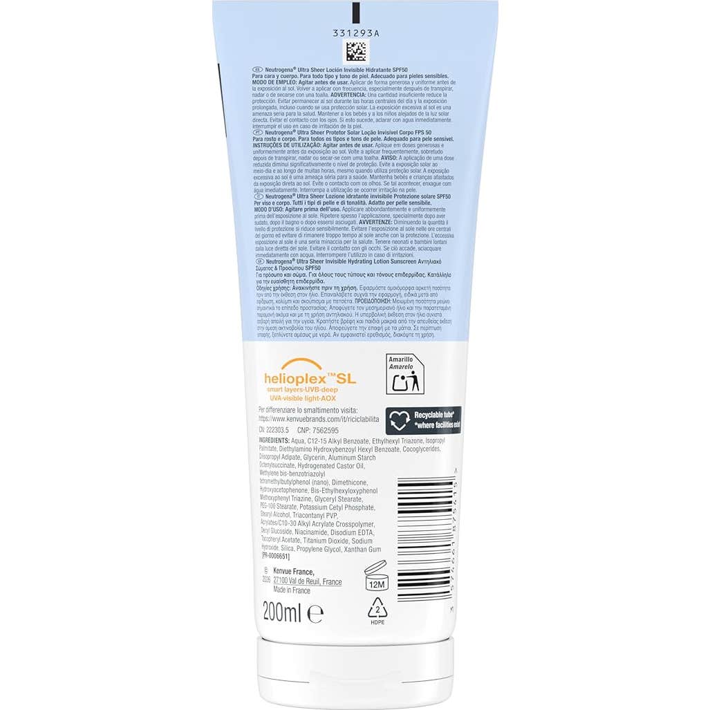 Neutrogena Ultra Sheer Loção Invisível SPF50 200 ml é uma loção hidratante que oferece uma proteção solar de amplo espectro, ideal para todos os tipos de pele, incluindo as mais sensíveis. Sua fórmula ultraligeira e não oleosa é absorvida rapidamente, deixando uma sensação imperceptível e um acabamento mate graças à tecnologia Dry-Touch. Este produto evita a sensação pegajosa e o rastro branco, o que o torna uma opção confortável para o uso diário.