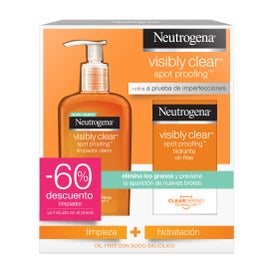 Neutrogena Visibly Clear Spot Proofing Facial Care R outine é uma embalagem composta por um produto de limpeza facial Visibly Clear 200ml e um hidratante sem óleo Visibly Clear 50ml.