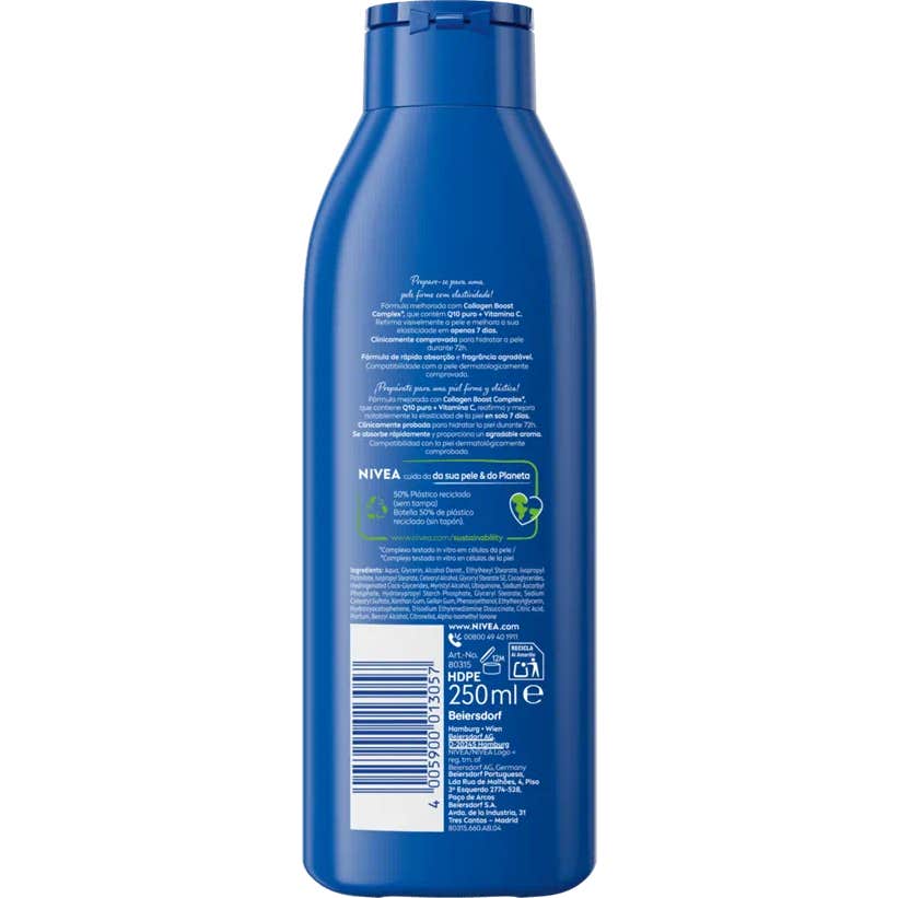 Nivea Q10 Leite Corporal Refirmante 250ml é um creme hidratante projetado para melhorar a firmeza da pele. Este produto é enriquecido com dois potentes antioxidantes: Q10 e vitamina C, que trabalham em conjunto para refirmar a pele e potencializar sua elasticidade em um período de dez dias.
