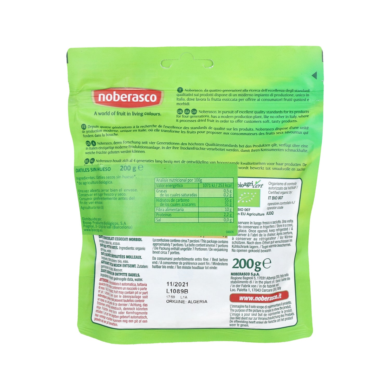 Datiles macios, desidratados e sem caroço, provenientes da agricultura ecológica, com uma textura carnosa e suave que os torna ideais para a elaboração de diferentes tipos de pratos ou confeitaria.