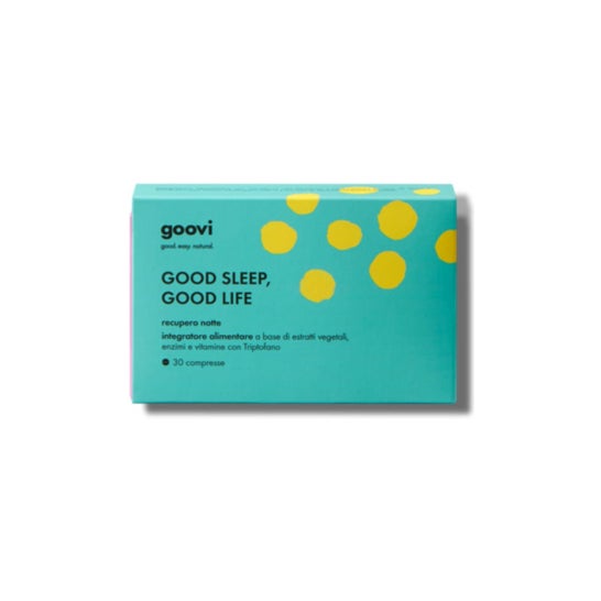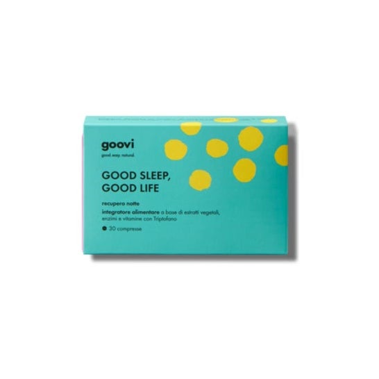 Goovi Good Sleep good life Recupero Notte 30comp é um suplemento à base de extratos de plantas, vitaminas, triptofano, extrato de vassoura (que promove o relaxamento) e rhodiola rosea (um tónico natural que atua como tónico em caso de fadiga física e mental). Além disso, também contém enzimas digestivas. Indicado para conciliar um sono reparador. Adequado para veganos, sem lactose e sem glúten. Este suplemento não substitui uma dieta saudável e um estilo de vida equilibrado.