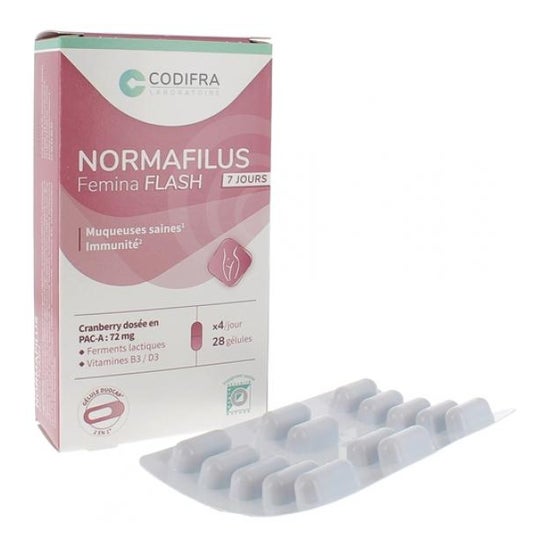 Normafilus Femina Flash 28 cápsulas é projetado para o cuidado do conforto íntimo feminino. Esta fórmula combina extrato de cranberry, fermentos microbiológicos e vitaminas essenciais. É um aliado diário para aquelas que buscam manter o equilíbrio da flora vaginal e reforçar as defesas naturais.