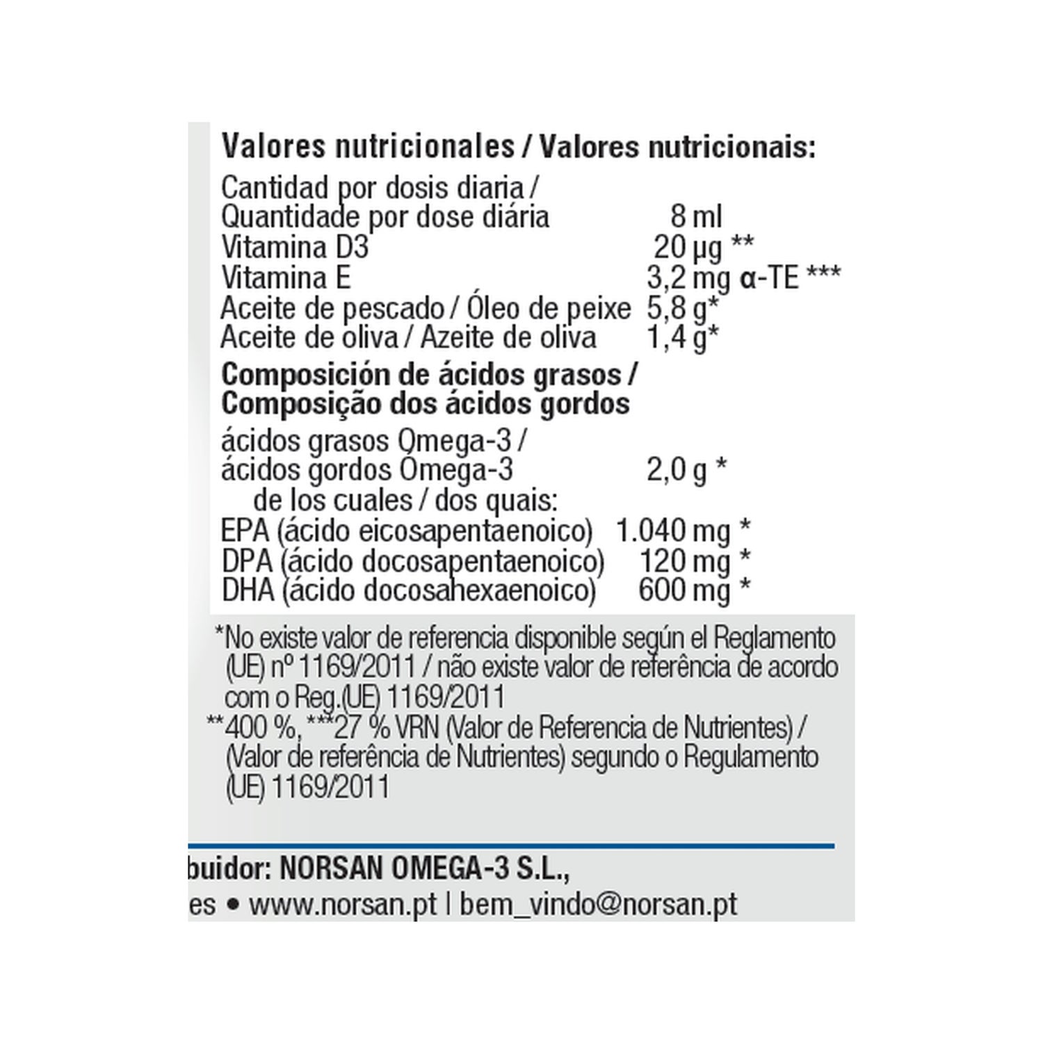 Formulado à base de óleo de peixe natural, mistura de tocoferóis e d-alpha-tocoferóis, colecalciferol, além de óleos de limão, bacalhau e de oliva virgem. Além disso, possui um agradável sabor de limão.
