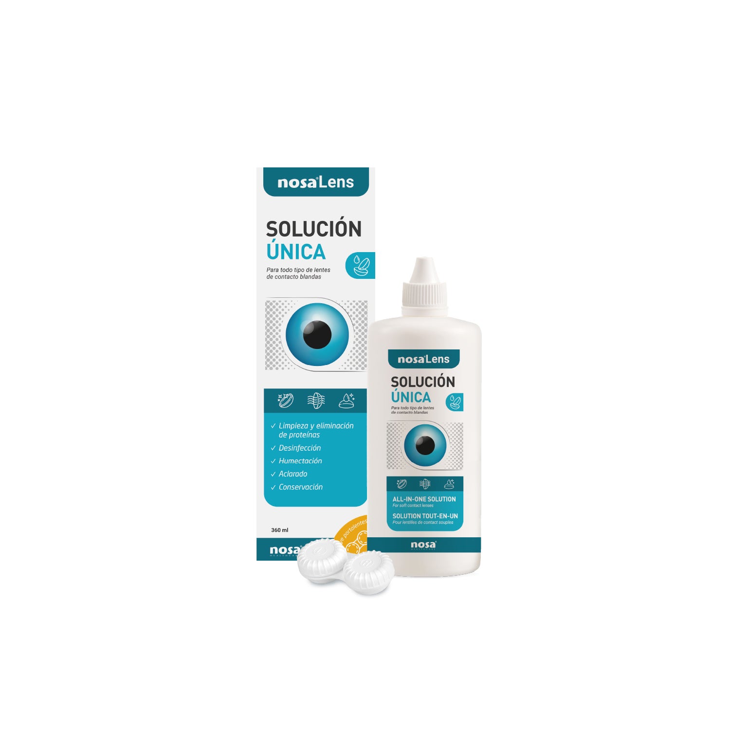 Nosa Lens Solução Única te ajudará a limpar e desinfetar todo tipo de lentes de contato macias (convencionais, descartáveis...). O uso contínuo desta solução favorecerá a eliminação dos depósitos de proteínas que se acumulam nas lentes de contato.