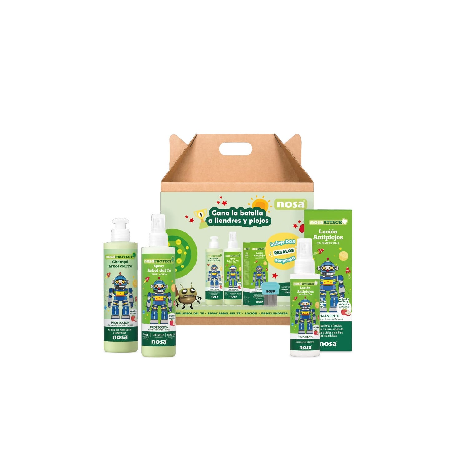 Nosa Pack Ahorro Maçã é a solução perfeita para proteger e cuidar do cabelo infantil, especialmente em ambientes escolares ou durante atividades que favorecem o contato entre crianças e a possível aparição de piolhos.