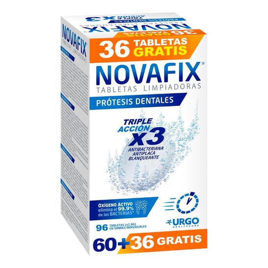 Limpeza das próteses dentárias. A fórmula 3-em-1 das tabletes de limpeza antibacterianos Novafix libera oxigênio ativo que previne a formação de tártaro, elimina manchas e a placa dental.