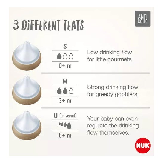 Nuk Perfect Match Tetina Silicone Anti-Cólica Fluxo S 2 Unidades As Tetinas Perfect Match de Silicone foram concebidas para proporcionar ao bebé uma alimentação confortável e natural. A sua forma distintiva facilita a adaptação do pequeno, permitindo que encontre rapidamente o ponto de sucção ideal. Favorece uma sucção mais natural. Asegura um fluxo constante de leite. Contribui para uma experiência de mamada relaxante. Recomendadas para bebés a partir do nascimento. Minimiza o desconforto associado a cólicas. Oferece um fluxo suave que se ajusta às necessidades dos bebés.