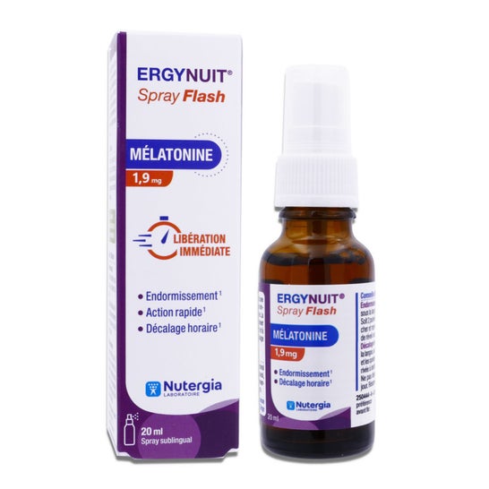 Nutergia Ergynuit Spray Flash 20 ml é um complemento alimentar em formato spray que contém melatonina, projetado para oferecer uma ação rápida. Cada pulverização fornece 0,63 mg de melatonina, o que permite ajustar a dose de acordo com suas necessidades, com um máximo de três pulverizações por noite.