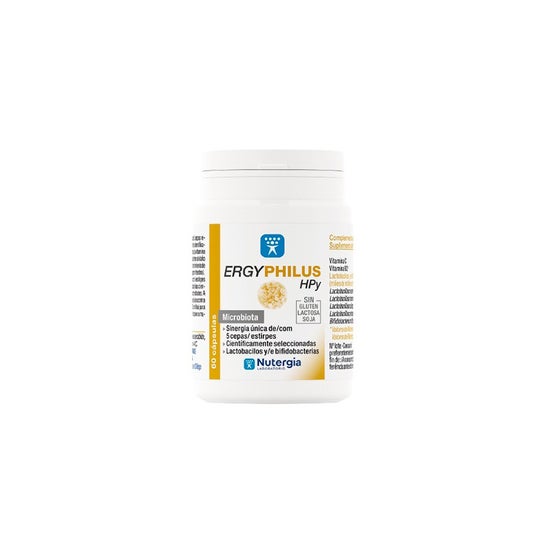 Nutergia Ergyphilus Hpy é um complemento alimentar que combina cinco cepas de lactobacilos e bifidobactérias selecionadas por suas propriedades benéficas. Essas cepas foram escolhidas por sua:
