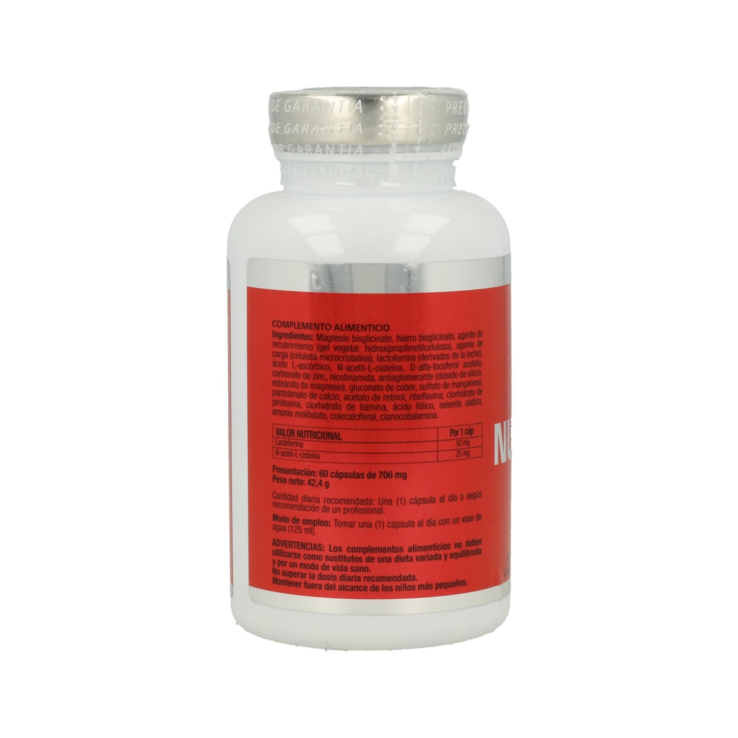 Suplemento alimentar em formato de cápsulas, composto por lactoferrina, N-acetil-L-cisteína, minerais e vitaminas. Com um elevado teor de ferro, é indicado para contribuir para a normal formação de glóbulos vermelhos e hemoglobina, e para o normal transporte de oxigénio no organismo.