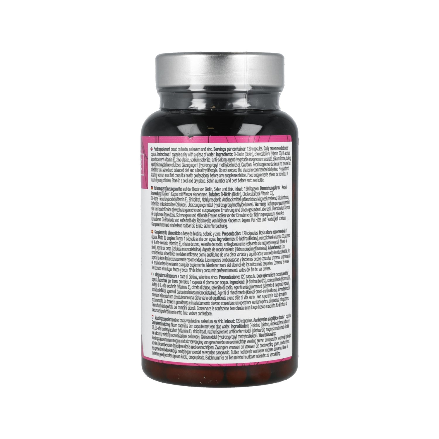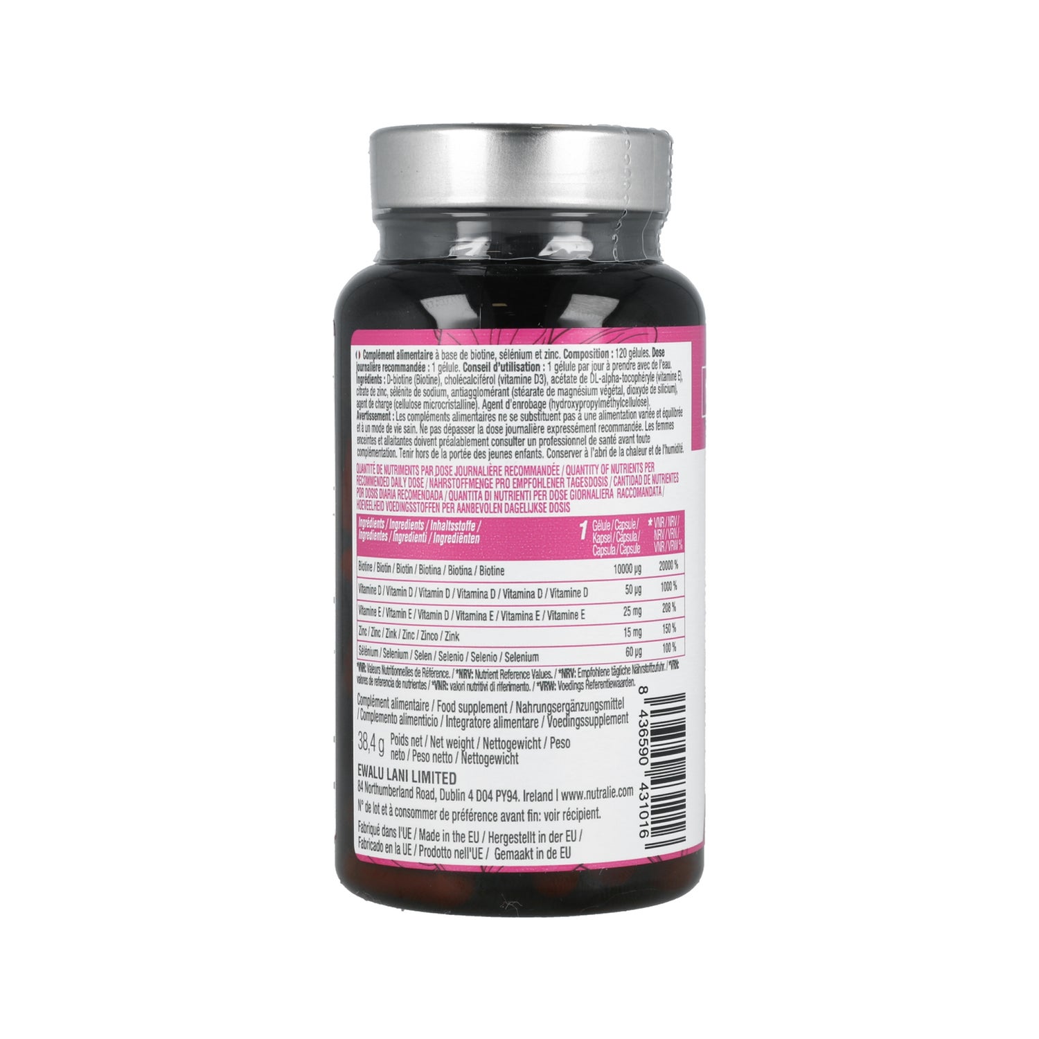 Nutralie Biotina Complex + Vit D e E 10000mcg Cabelo, Pele, Unhas 120caps é um complemento alimentar formulado com vitamina D3, vitamina E, biotina e zinco. Ajuda a manter o cabelo e a pele em condições normais graças às propriedades remineralizantes e antioxidantes de seus ingredientes.