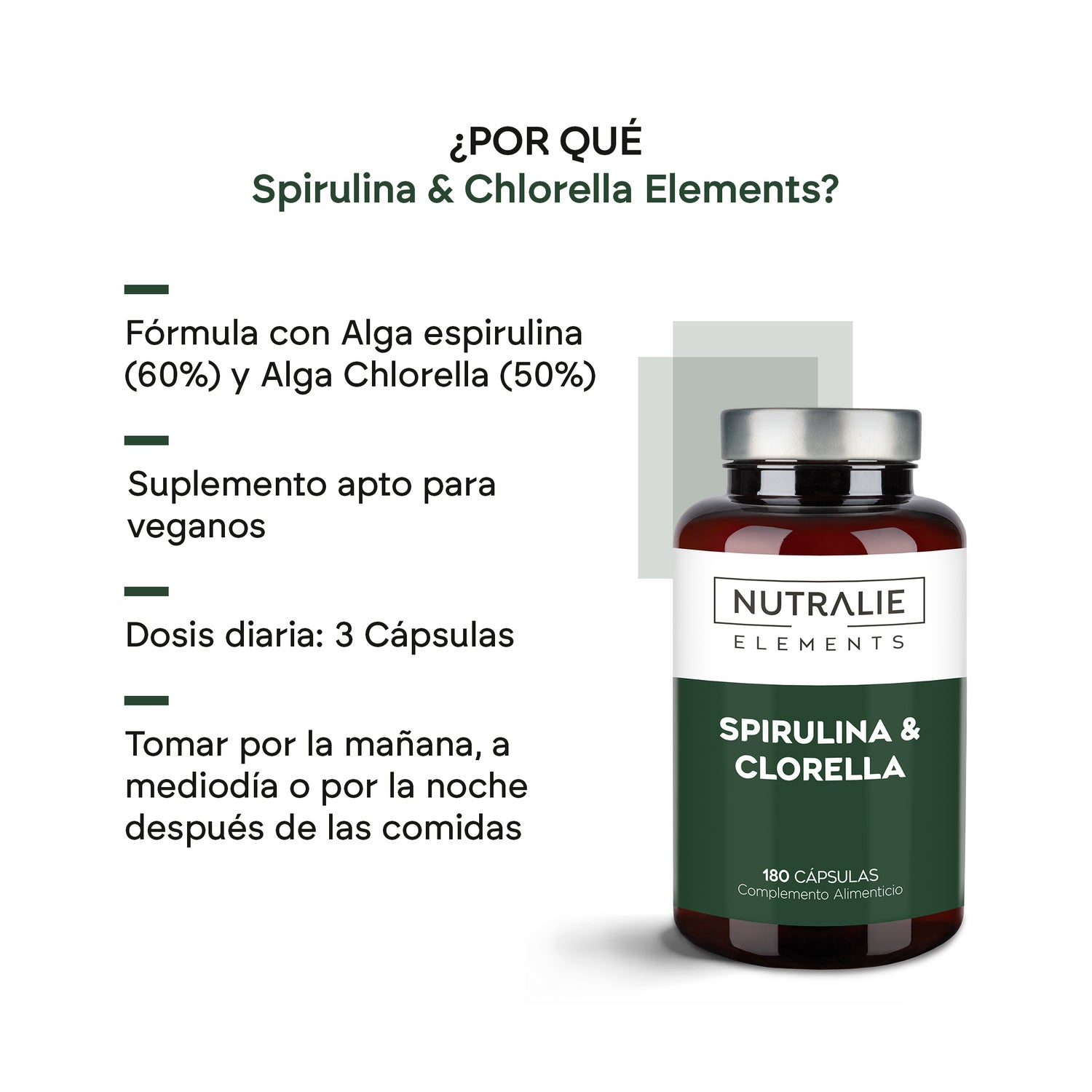 Nutralie Espirulina & Chlorella 1800mg Vegana 180caps é um suplemento alimentar formulado com pó de alga espirulina e chlorella.