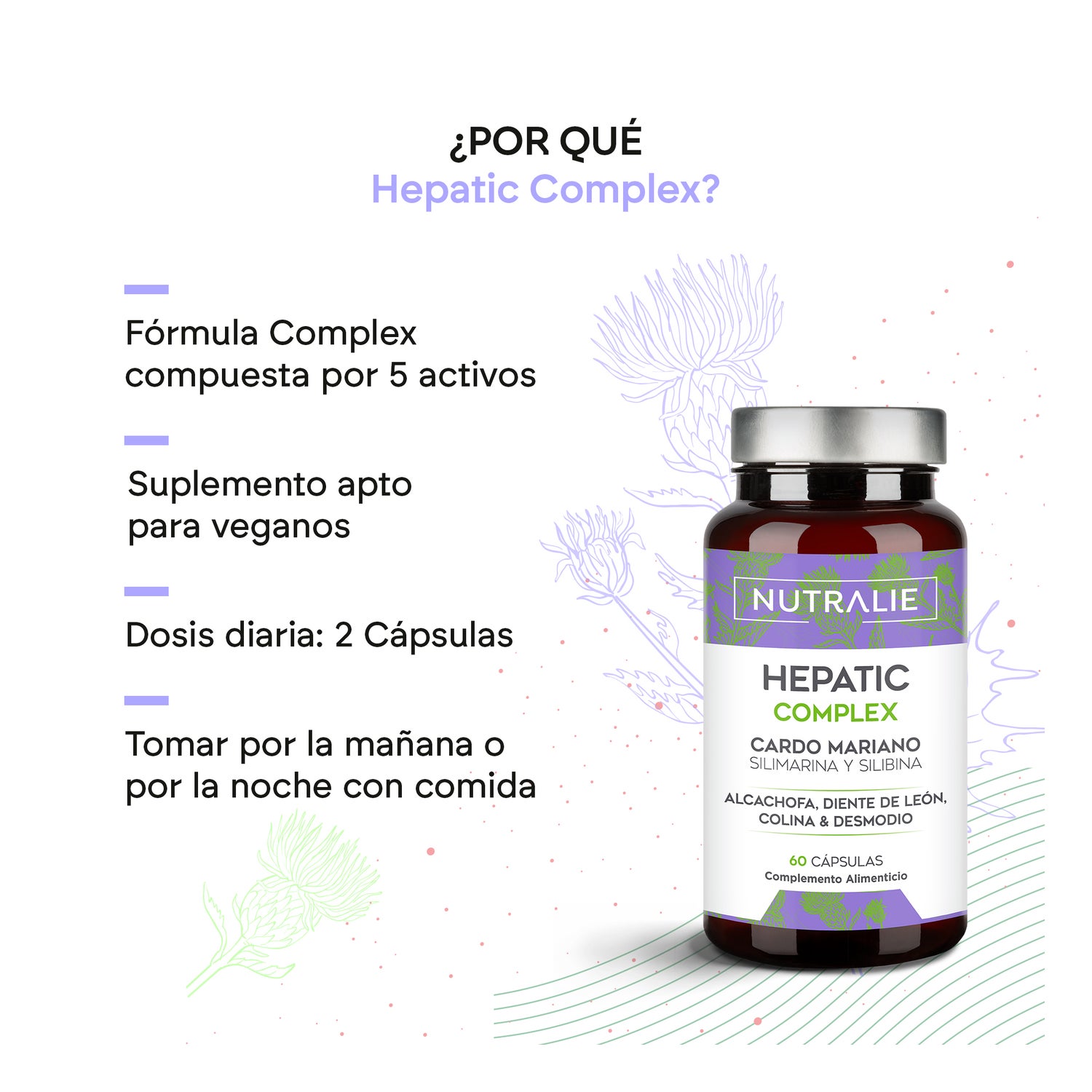 Suplemento alimentar formulado com um complexo de cardo mariano reforçado com dente-de-leão, alcachofra, silimarina e desmodium. Melhora a proteção e a depuração do fígado. A Nutralie é uma empresa de suplementos alimentares com elevados e rigorosos padrões de qualidade. Produto adequado para adultos, sob o conselho de um profissional.
