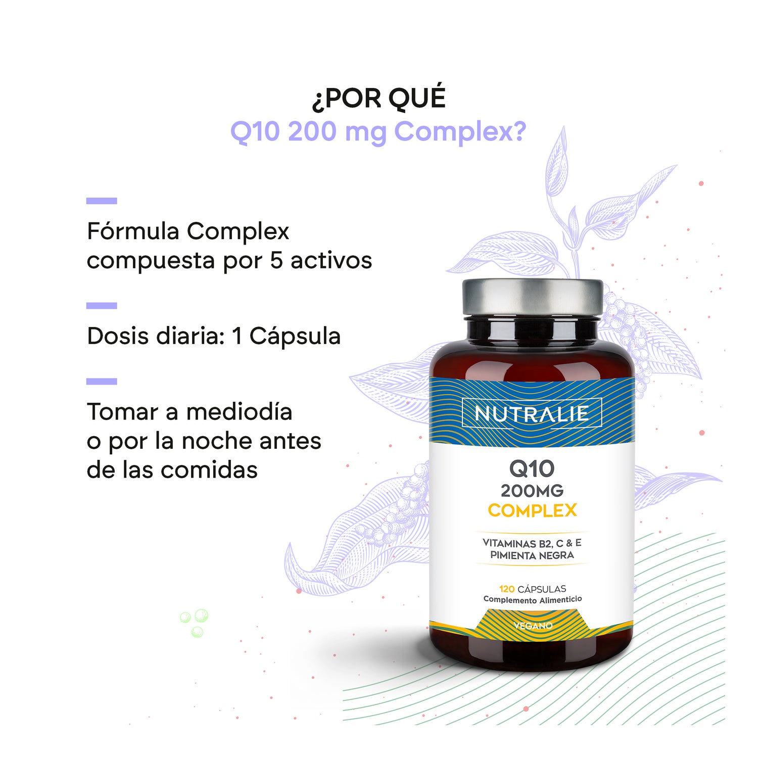 O Coenzima Q10 Complex da Nutralie é um suplemento alimentar formulado com 200mg de Q10 e 50mg de Vitamina C, E e B2. A Q10 é um potente antioxidante, que junto com a Vitamina C, E e B2, contribui para a proteção das células contra danos oxidativos, tornando-se um potente suplemento que ajuda na prevenção dos danos que os radicais livres causam às células. Assim, a Vitamina C e B2 presentes na nossa fórmula também ajudam a diminuir o cansaço e a fadiga, e a Vitamina C contribui para o funcionamento normal do sistema imunológico.