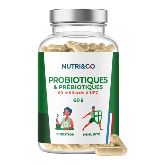 Nutri&Co Le Probio2 et flavonoides 60 Gélules é um suplemento alimentar que ajuda a promover uma boa digestão para evitar o desconforto associado, como o gás e a azia