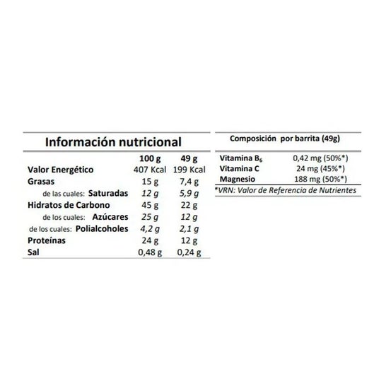 Barra à base de proteínas lácteas para consumir antes e depois do exercício físico. O seu alto teor de suplementos energéticos contribui para a manutenção e desenvolvimento muscular. A sua fórmula foi enriquecida com vitaminas B6 que permitem manter um metabolismo normal e vitamina C que ajuda a evitar o cansaço e a fadiga. Protege as células contra danos oxidativos, além disso, o magnésio favorece o equilíbrio eletrolítico, o funcionamento correto dos músculos e a síntese proteica. Os seus ingredientes contêm concentrado de derivados do leite, xarope de glicose e cobertura vegetal. A barra Nutrisport vem numa apresentação de formato prático com excelentes sabores que a tornam num alimento ideal para desfrutar a qualquer momento do dia, seja no final de uma sessão de treino ou como um lanche entre as diferentes horas.