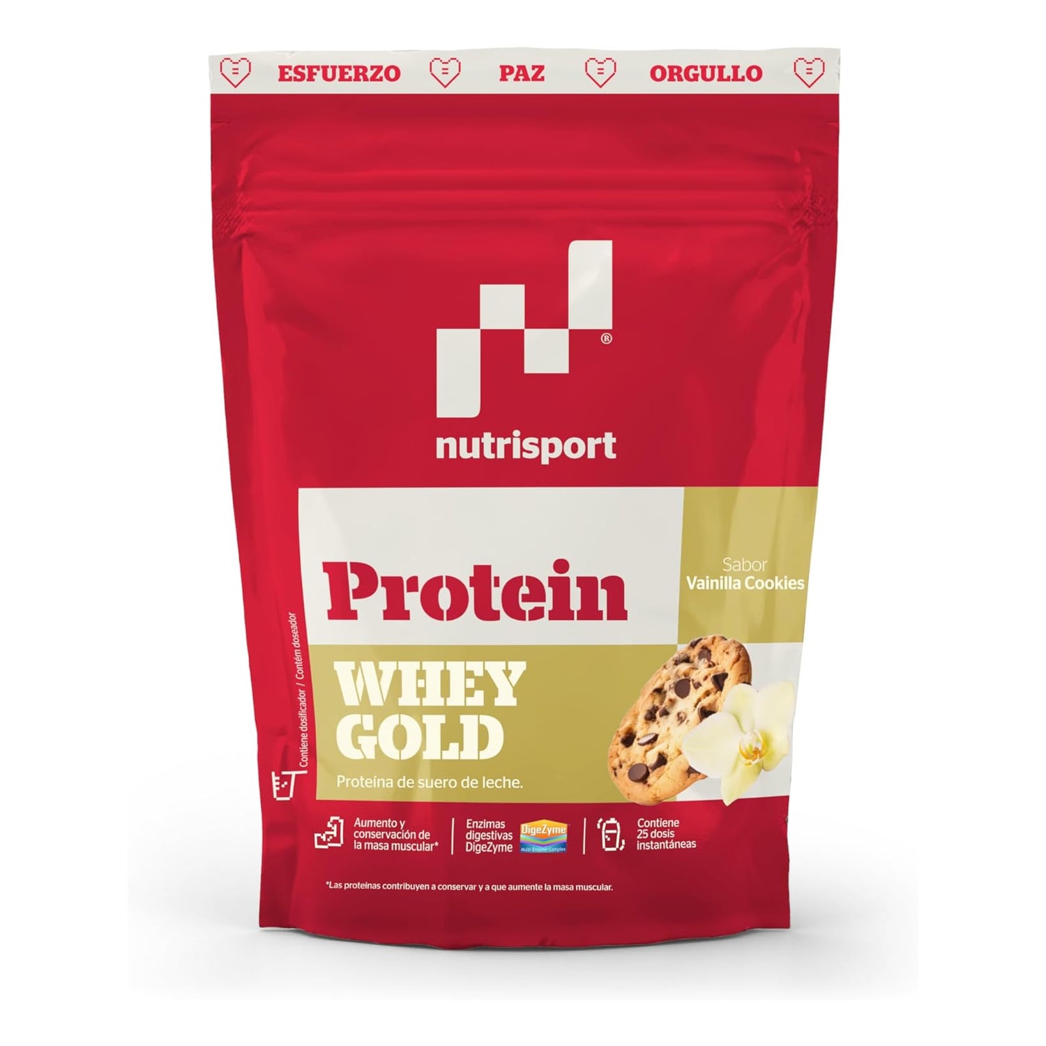 Nutrisport Whey Gold Protein Biscoito de Baunilha 500 gr é um complemento proteico pensado para atletas e pessoas ativas que buscam aumentar a massa muscular. Inclui concentrado de soro de leite de rápida absorção, orientado à recuperação pós-treino e ao manutenção e desenvolvimento da massa muscular, com sabor a biscoito de baunilha.