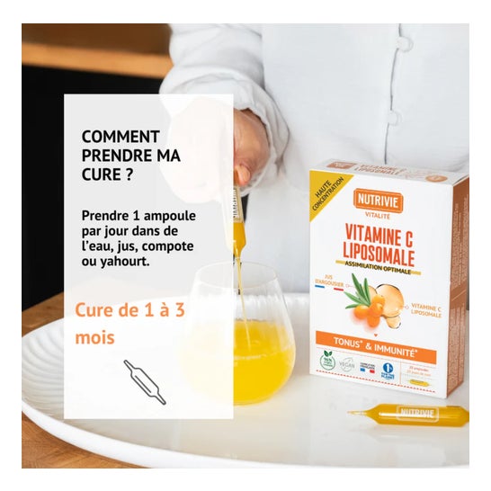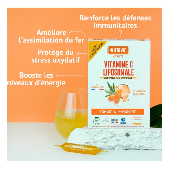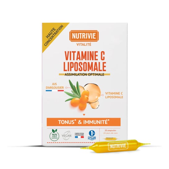 Nutrivie Ampolas de Vitamina C Lipossomal 20x15ml é um complemento alimentar à base de vitamina C lipossomal que oferece uma assimilação ótima para apoiar a imunidade e a energia.