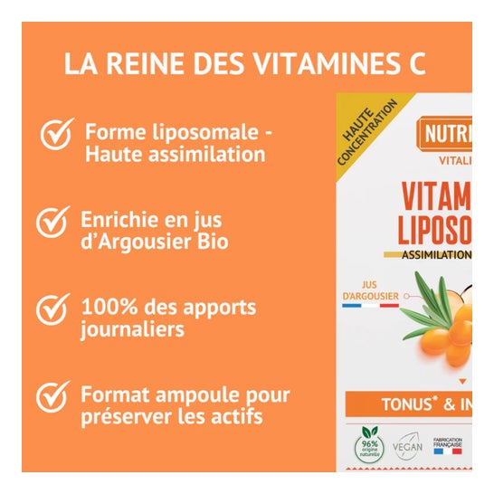 Esta vitamina C lipossomal de alta assimilação fornece 100 % das necessidades diárias, está enriquecida com espinheiro-marítimo para uma eficácia reforçada e é apresentada em formato ampola para preservar plenamente a integridade dos ativos.