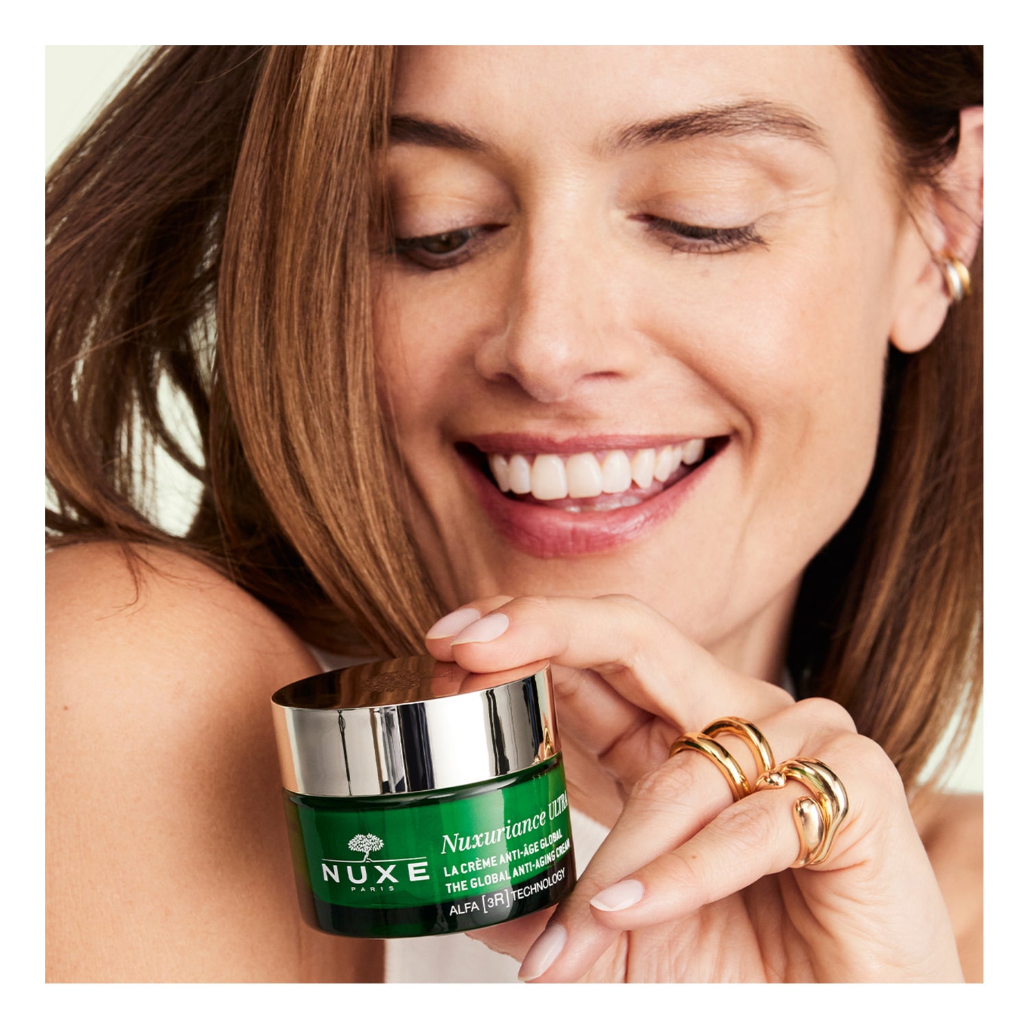 Alisa as rugas, reafirma a pele e potencializa a luminosidade com Nuxuriance Ultra: creme de dia, creme de noite e contorno de olhos e lábios. Tecnologia ALFA [3R], resultados clinicamente comprovados.