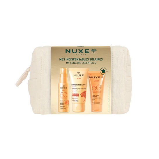 Nuxe Sun Necessaire de Viagem Indispensáveis Solares é um pack de cuidados faciais e corporais que ajuda a proteger a pele do sol.