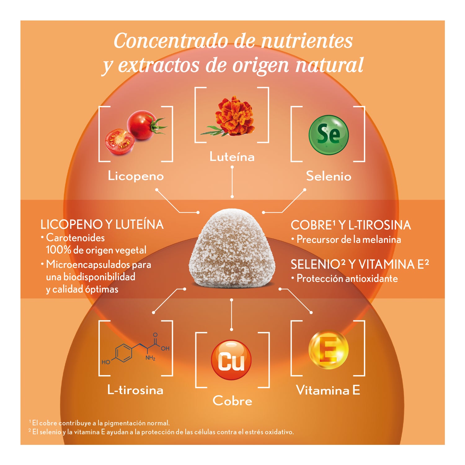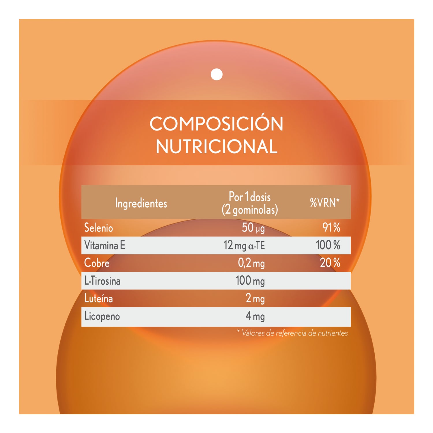 Além disso, contém selênio e vitamina E que ajudam a proteger a pele da oxidação celular. Além disso, sua fórmula com cobre, licopeno, luteína e L-tirosina ajuda a conseguir um bronzeado uniforme e a preservar sua duração.
