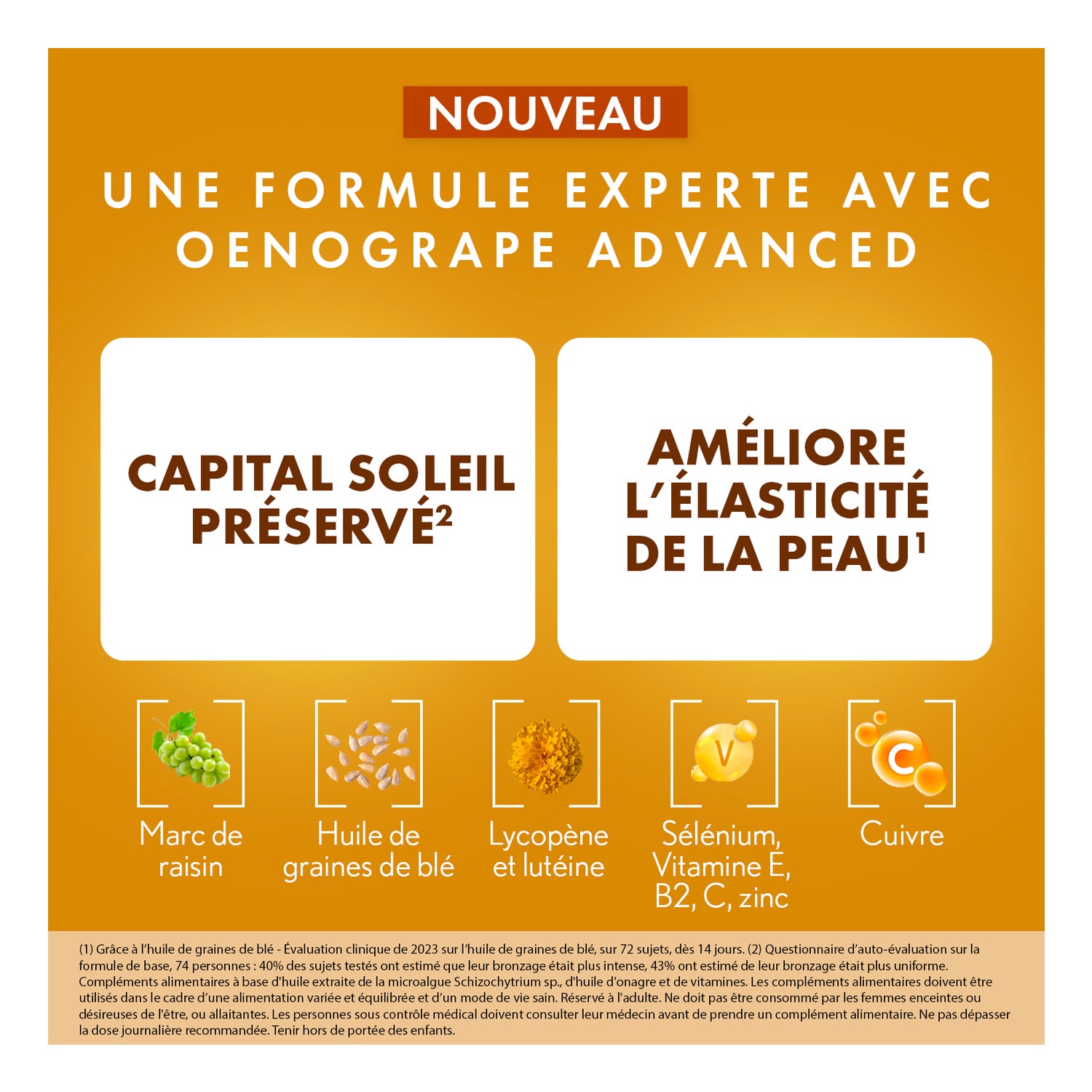 uma ação antienvelhecimento visível em apenas 14 dias, graças ao óleo de sementes de trigo e ao bagaço de uva.