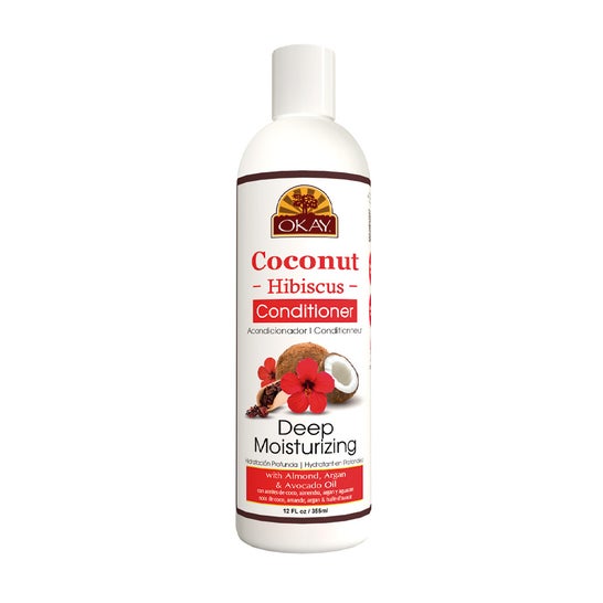 Condicionador com hibisco e coco Okay que proporciona vigor e hidratação ao cabelo seco e quebradiço. Contribui para evitar as pontas duplas e o frizz.
