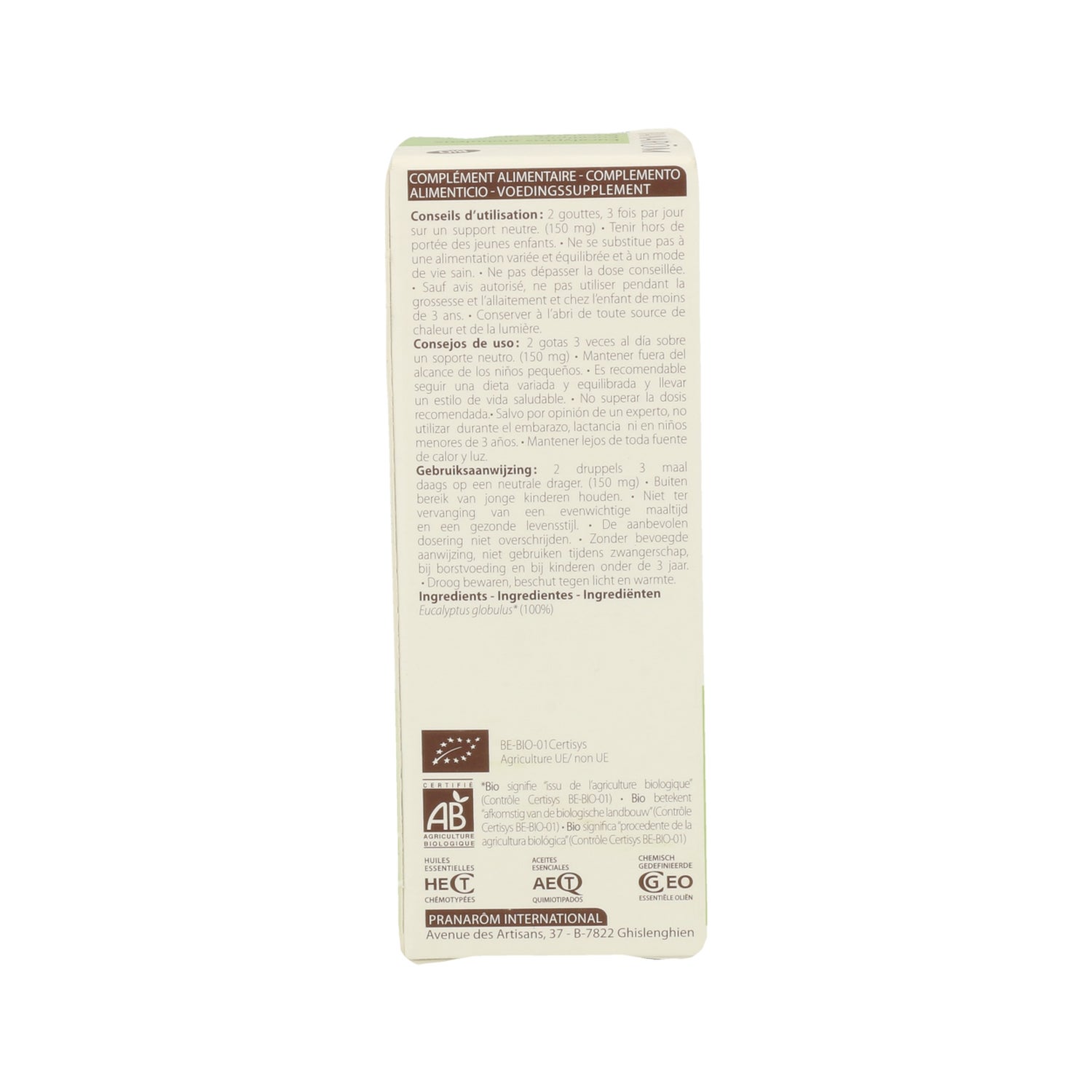 OÓleo Essencial de Eucalipto Orgânico Pranarom 10ml acalma intensamente as dores de garganta. Este óleo essencial 100% puro e biológico ajuda a expetorar e melhora os problemas catarrais graças aos seus benefícios expectorantes, anti-sépticos e anti-catarrais.