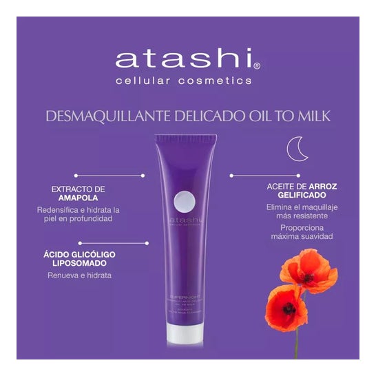 Supernight Oil To Milk Makeup Remover 50ml é um desmaquilhante de textura suave que limpa a maquilhagem e as impurezas do rosto, tratando a pele em profundidade. Deixa a pele purificada e livre de impurezas. Também proporciona ao rosto uma humidade adequada e protege-o da luz azul. Formulado com óleo de arroz, extracto de papoila e AHA.