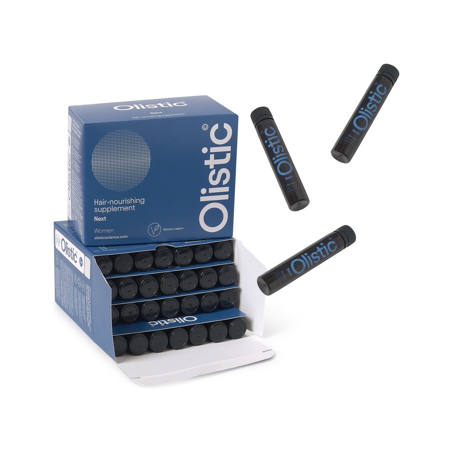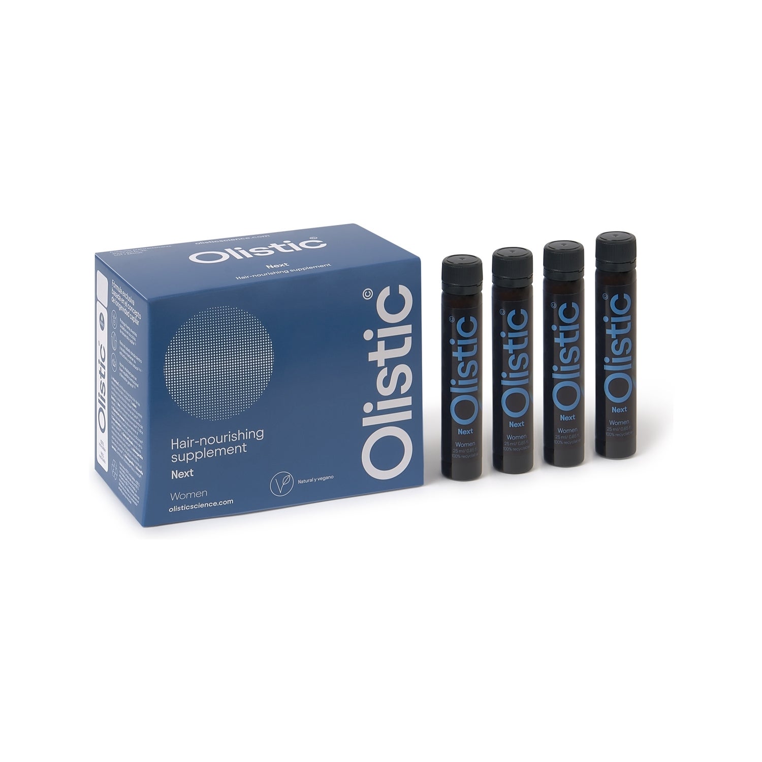 Olistic Pack Next Women Hair Nourishing Supplement 2x 28und é um complemento alimentar bebível, projetado para o cuidado capilar em mulheres a partir de 50 anos.