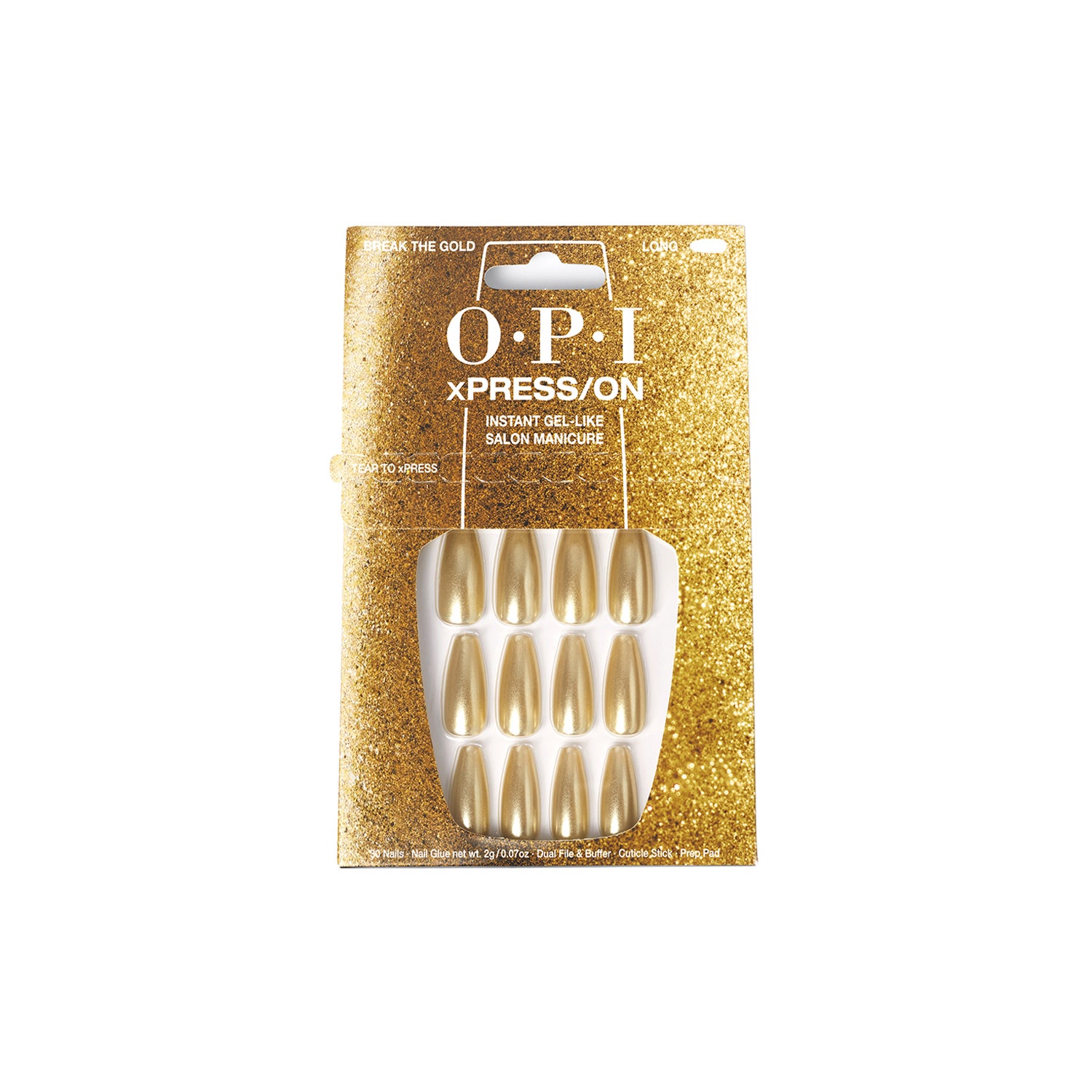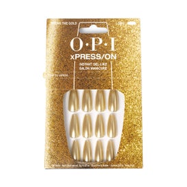 Opi xPRESS/ON Kit Unhas Postiças Long Break the Gold é a solução ideal para quem busca uma manicure dourada profissional e duradoura em casa. Este kit permite exibir unhas longas, sofisticadas e brilhantes, perfeitas para qualquer ocasião especial ou para o uso diário.