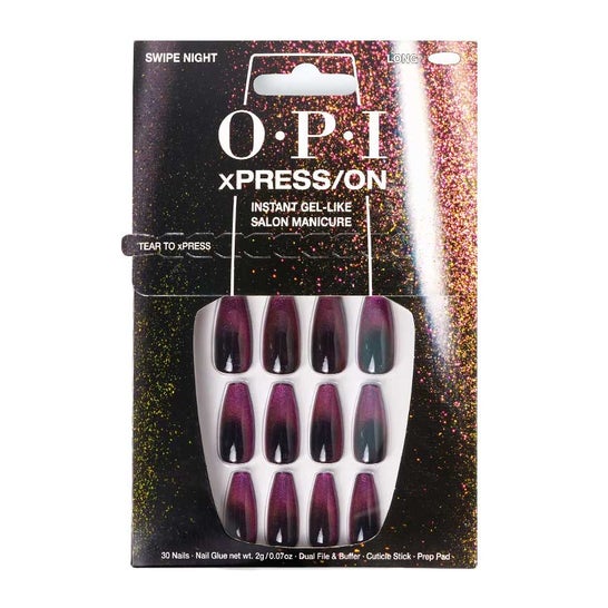 Opi xPRESS/ON Kit Unhas Postiças Long Swipe Night é a opção ideal para quem deseja exibir unhas impactantes e sofisticadas em pouco tempo, sem sacrificar conforto nem qualidade. Este kit inclui unhas postiças longas em formato coffin com um acabamento preto e magenta efeito cat eye, perfeitas para destacar o estilo em qualquer ocasião.