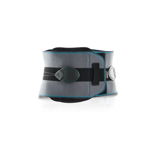 Este corset se concentra na imobilização e proteção lombar, oferecendo uma fixação firme que se adapta à anatomia do usuário. Seu sistema de ajuste por meio de multipoleas, junto com seus componentes semi-rígidos e termoformáveis, permite regular o grau de imobilização e garante uma compressão homogênea sem esforço.