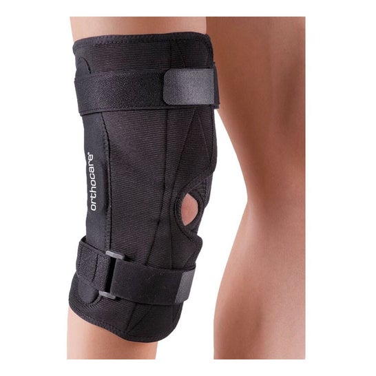 Joelheira estabilizadora de neoprene com articulações policêntricas, rótula aberta, cintas de fixação e fivela patelar para reduzir o movimento do joelho, especialmente indicada para pessoas que sofreram algum tipo de lesão ou desconforto e que desejam reduzir a dor ao caminhar ou fazer algum tipo de atividade ou esporte.