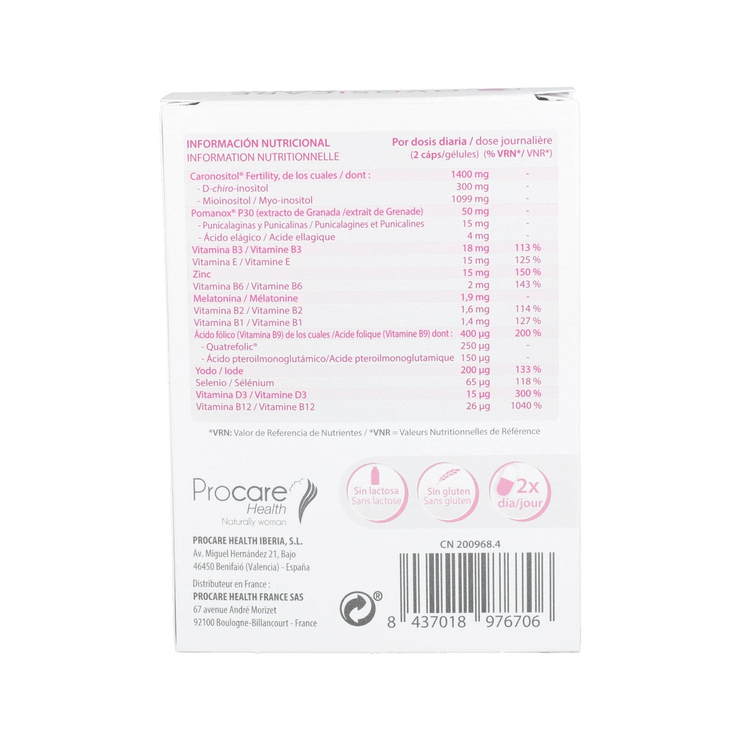 Caronositol® Fertilidade, do qual D Chiro inositol, Myoinositol; Pomanox® P30 (extracto de romã), Punicalaginas, Punicalinas, Ácido Pélico, Vitamina B3, Vitamina E, Zincoácido gico, Vitamina B3, Vitamina E, Zinco, Polígono Cuspidatum extracto do qual Resveratrol, Vitamina B6, Melatonina, Vitamina B2, Vitamina B1, Ácido fólico (Vitamina B9) do qual Quatrefolic, Ácido Pteroylmonoglutâmico; Iodo, Selénio, Vitamina D3, Vitamina B12.