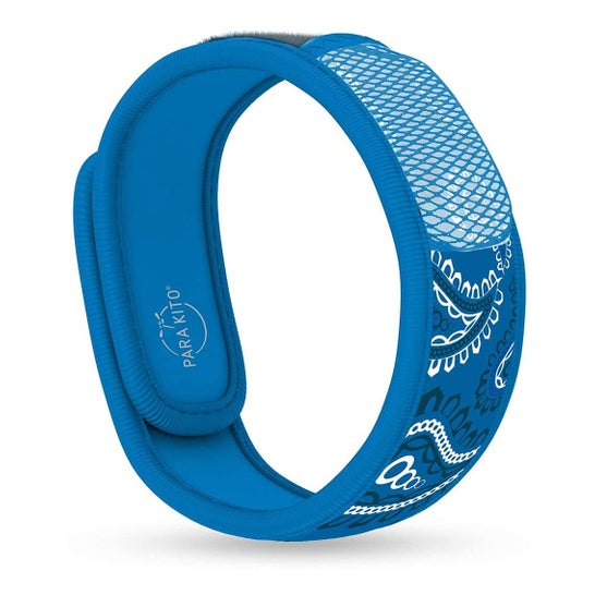 Pulseira de tecido com sistema de fecho de velcro e compartimento integrado para comprimidos repelentes, formulada com ingredientes botânicos. Ajuda a proteger as crianças pequenas das picadas de mosquitos e é útil tanto em ambientes secos como húmidos. Os comprimidos são recarregáveis e cada um deles é eficaz por até 15 dias.