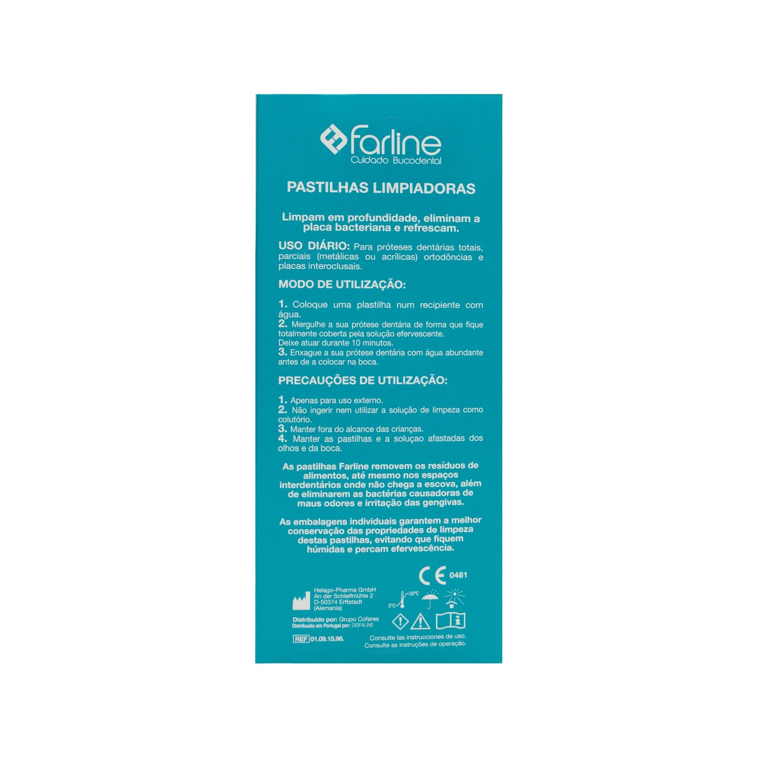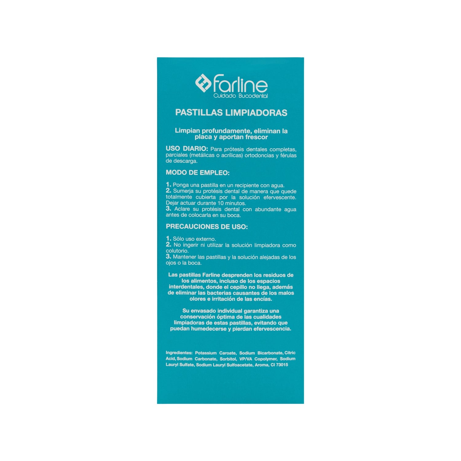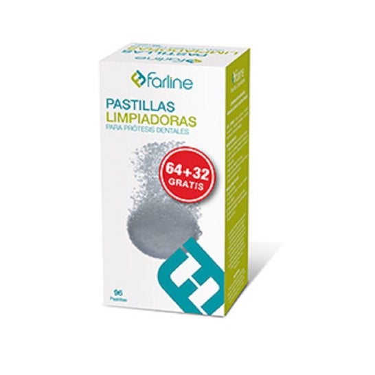 Os comprimidos de limpeza de dentaduras Farline são comprimidos efervescentes que limpam profundamente as dentaduras, reduzindo a placa bacteriana que adere a elas. Estes comprimidos libertam resíduos alimentares, mesmo nos espaços interdentais onde a escova não penetra. Além disso, ele irá eliminar as bactérias que causam maus cheiros e irritação das gengivas. Você pode usar estes comprimidos diariamente em todos os tipos de próteses: total, parcial, ortodôntica e talas de descarga.