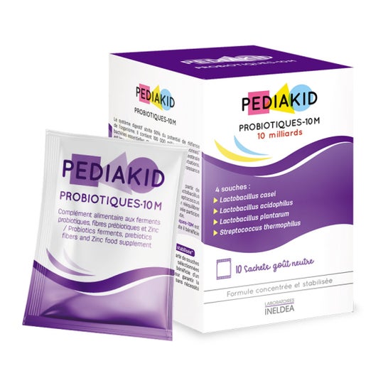 Pediakid Probiotiques-10M 10 Envelopes é um suplemento alimentar à base de 4 estirpes de probióticos com um teor garantido de 10 mil milhões por envelope e de zinco, que reequilibra a flora intestinal. Pediakid Probiotiques-10M foi desenvolvido a partir de fermentos lácteos (Lactobacillus casei, Lactobacillus acidophilus, Lactobacillus plantarum, Streptococcus thermophilus) rigorosamente seleccionados para reequilibrar a flora intestinal. A sua fórmula com inulina de chicória ajuda a favorecer o crescimento das boas bactérias intestinais. Para reforçar a imunidade, Pediakid Probiotiques-10M é rico em zinco. Apresentado sob a forma de bisglicinato, a sua biodisponibilidade é óptima. Este produto é adequado para crianças a partir dos 6 meses de idade. A flora intestinal das crianças é imatura e particularmente sensível a alterações. Uma alimentação desequilibrada, o stress do crescimento ou a toma de antibióticos podem perturbar o seu equilíbrio. Sem glúten, sem sabor e sem corantes, esta fórmula concentrada e estabilizada deve ser consumida no âmbito de uma alimentação variada e equilibrada e de um modo de vida saudável. Não exceder a dose recomendada.