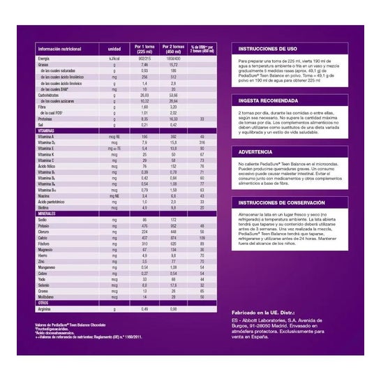 Instruções de uso: Para preparar uma dose de 225 ml, despeje 190 ml de água em temperatura ambiente ou fria em um copo e misture gradualmente 5 medidas rasas (aprox. 49,1 g) de PediaSure Teen Balance em pó. Dose = 49,1 g de pó em 190 ml de água para obter 225 ml. Pode ser aquecido, mas não acima de 35ºC para manter as propriedades nutricionais.