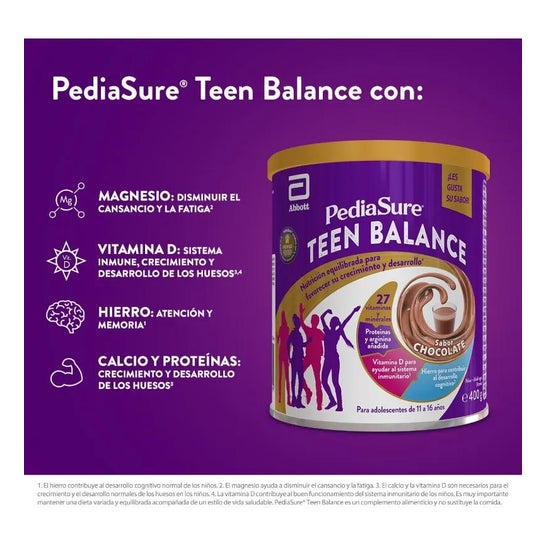 PediaSure Teen Balance® é um complemento alimentar com proteínas, vitaminas e minerais, especialmente formulado para satisfazer as necessidades nutricionais de adolescentes de 11 a 16 anos. Durante a adolescência, a maioria dos meninos e meninas experimenta um último período de grande crescimento e precisa de até 2 vezes mais nutrientes essenciais em comparação com antes da puberdade4.