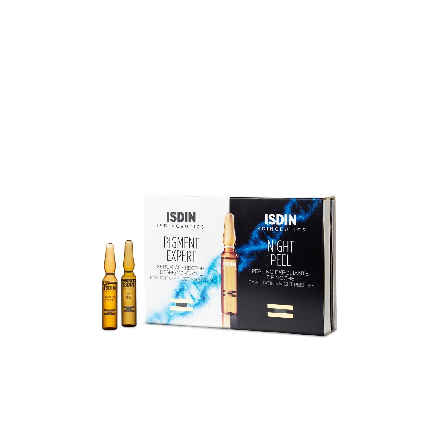 Isdinceutics Pigment Expert + Night Peel 20 Ampoules combina dois tratamentos de dia e de noite, Isdinceutics Pigment Expert + Isdinceutics Night Peel.